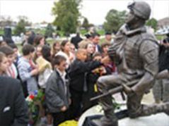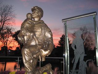 The setting, on the grounds of Washington Park East Cemetery, Funeral Center and Community Life Center, is visible to those driving by Washington Street, the Old National Road. Located in the southeast corner of the grounds, the Memorial is comprised of a fountain in Lake Potomac; a glass background (containing an etching of the traditional Minuteman); “The Rescue,” a larger-than-life bronze statue of a Guardsman in modern gear, holding a child, sculpted by Bill Wolfe; and bricks, benches, and flag poles.